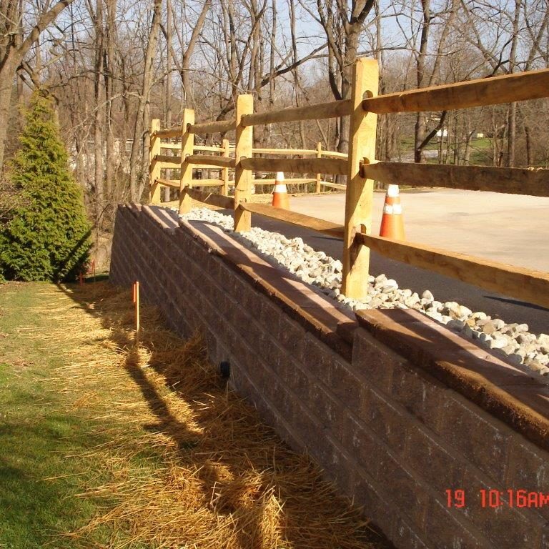 PVL handled the following within their scope of work: Permitting and contractor license with local township, Utility Notification, Property line survey, Coordination of grading permit, wall design and permit, Tearout and Excavation, Safe removal of timber and onsite soil, new wall construction, township inspection scheduling, Split rail fence installation, final rake and seed, and asphalt paving with a curb. Project took a 4 man crew a total of 6 working days to complete including the late addition of a raised vegetable garden retaining wall . Company owned equipment included a KX080 Kubota excavator and TL150 skidsteer, both with rubber tracks to minimize collateral damage. PVL also used one of their dumpster can trucks to export timbers and excess fill while efficiently importing block and stone footing and backfill material on the backhaul.