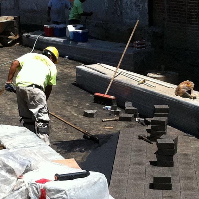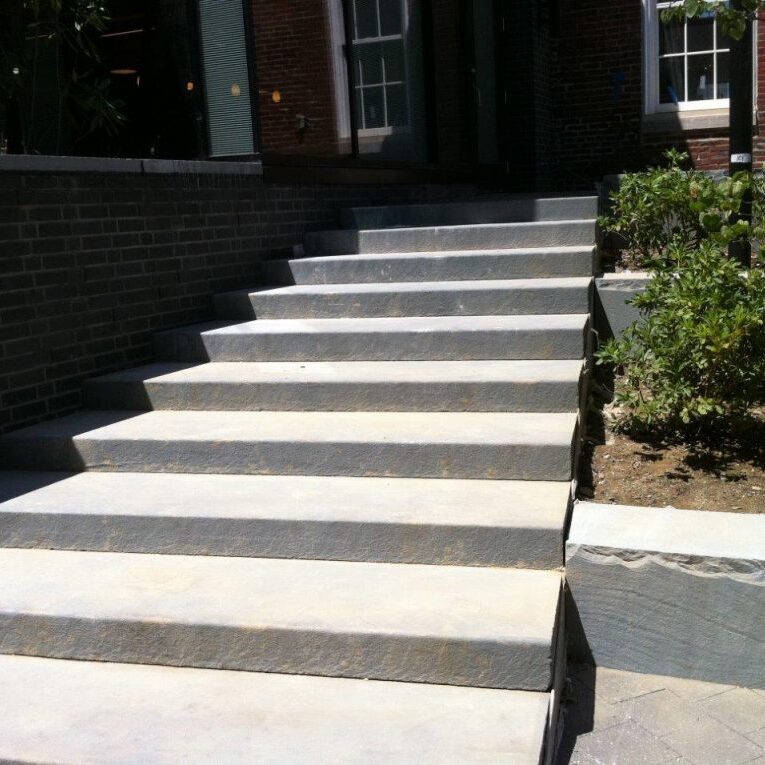 Plaza projects can present unique challenges with non ordinary materials often specified. This particular project blended 6 tractor trailer loads of New York River BlueTM Bluestone park benches with 8,000 sq ft of 8”x8” bituminous set tudor finished asphalt pavers and brush finished stainless steel plates connecting many of the benches to retain landscape areas.